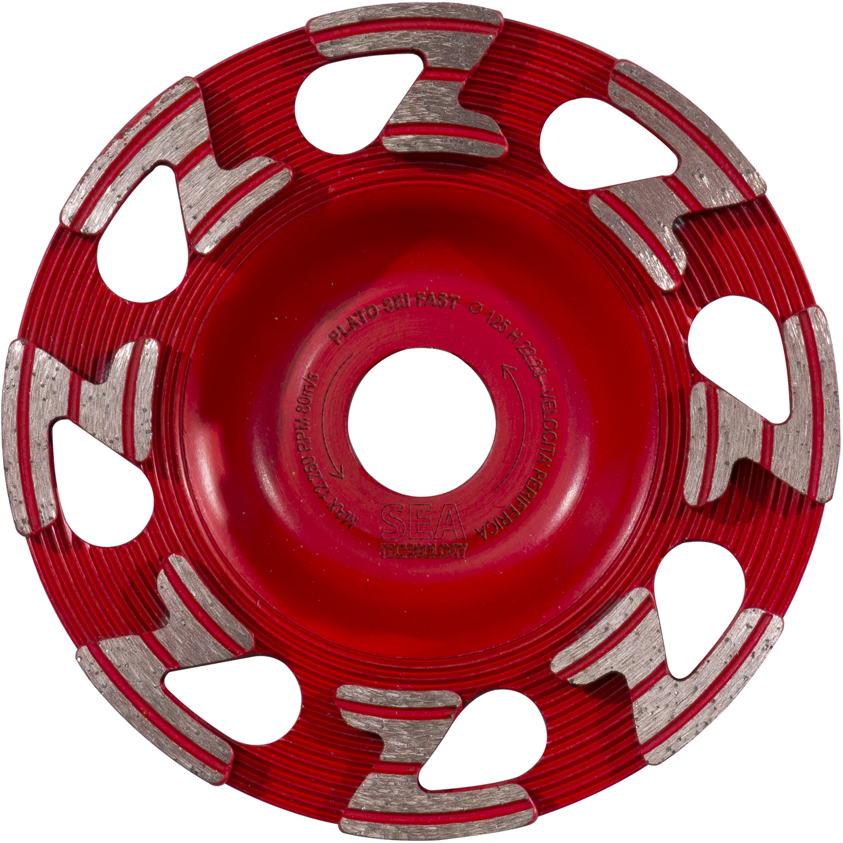 Plato Sei Fast abbina qualità, versatilità e velocità: si può infatti utilizzare su qualsiasi materiale da costruzione come cemento, granito, pietra naturale, porfido e laterizi. Abbinato alla levigatrice Seagrind 125, il cui motore raggiunge i 10.000 giri, garantisce la massima velocità possibile di lavorazione; prestazioni ottimali anche su levigatrici di altri marchi e su smerigliatrici. Il tutto è reso possibile dalla sua speciale forma, dalla posizione dei fori tra i segmenti che agevolano l’estrazione delle polveri, dalla forma a “Z” del segmento che aumenta notevolmente velocità e scorrevolezza.