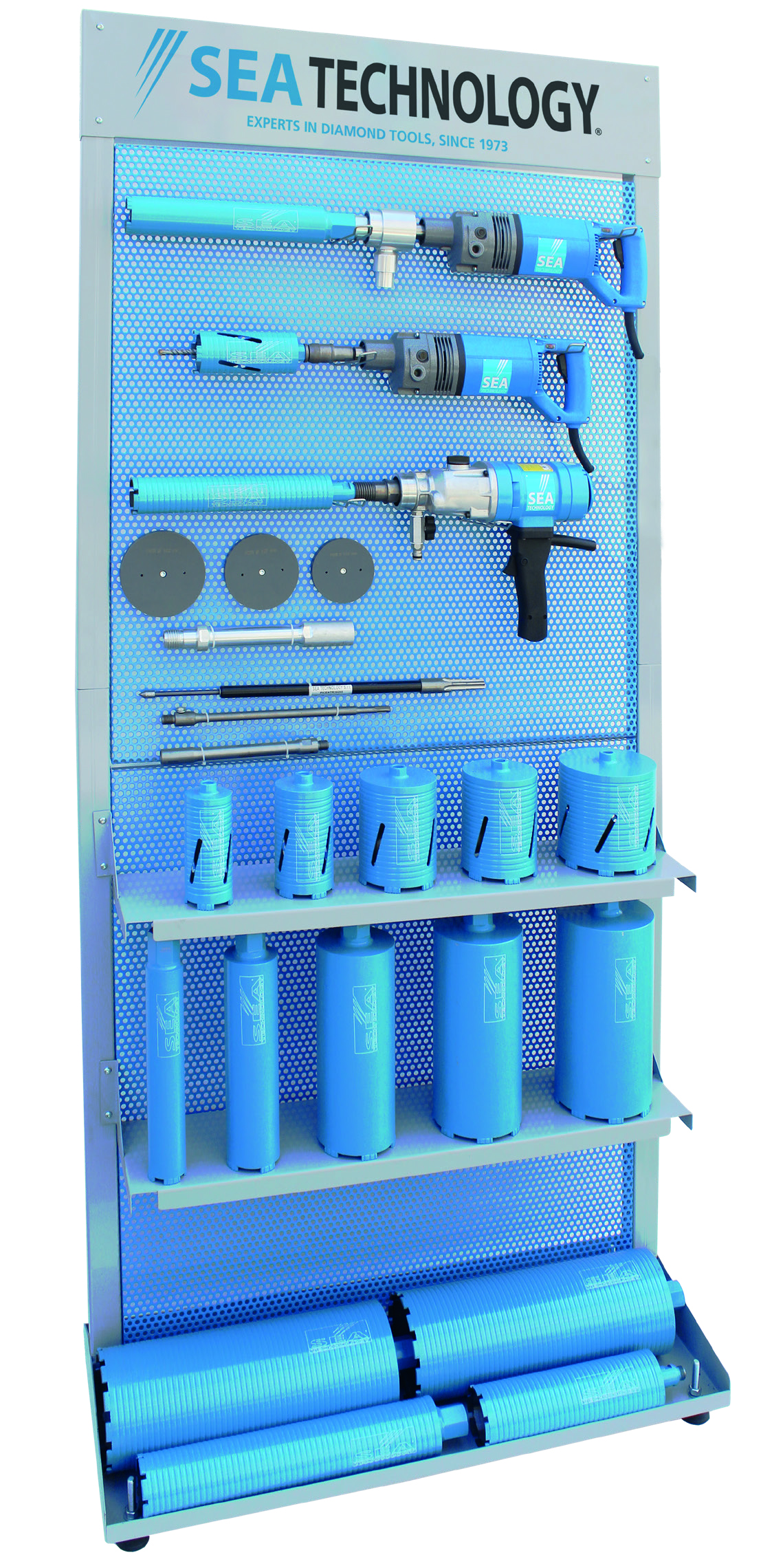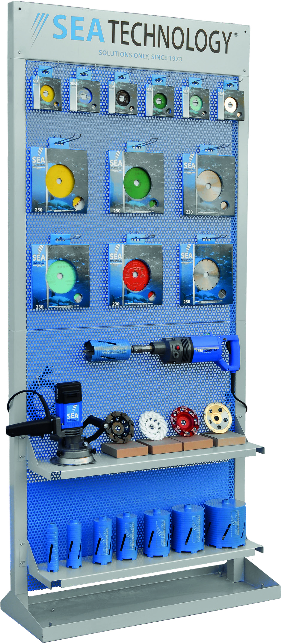 Sono disponibili dei nuovi modelli di espositore, da pavimento e da banco, che coprono l’intera gamma di soluzioni per il taglio, il carotaggio e la levigatura. Concepiti nell’ottica di dare la massima visibilità possibile ai prodotti contenuti, permettono al rivenditore di ottimizzare gli spazi e agevolano il prelievo da parte dei visitatori del punto vendita. Molto utili sono ad esempio gli espositori da banco, specifici per macchine e tipologie di accessori, che possono essere facilmente collocati nelle aree di maggiore transito da parte dei clienti, anche in spazi estremamente ridotti.
